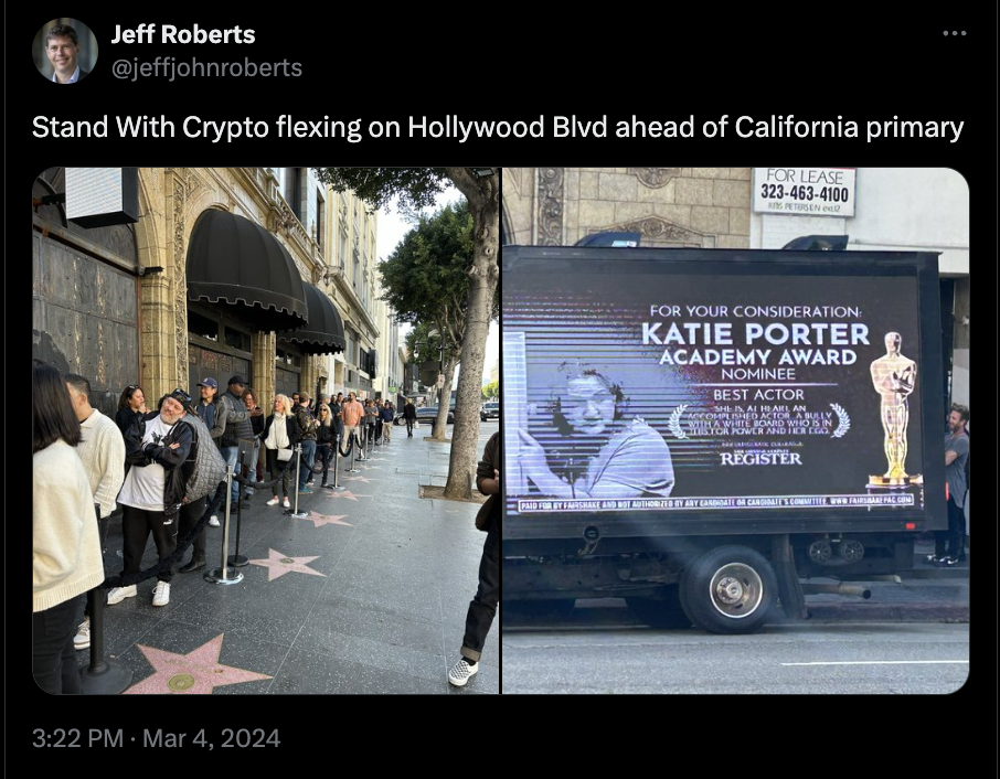 It’s Super Tuesday here in the U.S. as voters head to the polls to make their voices heard on burning issues of the day like the economy, abortion, and cryptocurrency regulation. I’m not sure about that last one, but if you were on Hollywood Boulevard on Monday afternoon, there were plenty of people there—including Coinbase CEO Brian Armstrong and rap legend Nas—who would have assured you that, yes, crypto voters are a force to be reckoned with this election season.