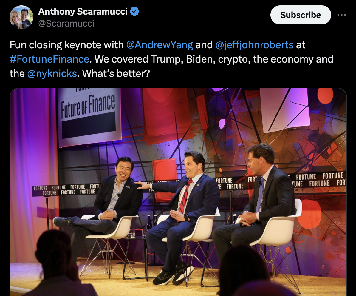 Happy Friday everyone. I spent yesterday at Future of Finance in New York, a one-day event where Fortune brought together big names from traditional finance like BlackRock and Apollo, and newer players like PayPal and Robinhood. At the day’s crypto panel—which featured Coinbase, Grayscale, and Ripple—I was struck by how much the companies’ executives came across as part of the finance industry rather than, as has been the case in years past, as fringe challengers. The most remarkable moment when it came to crypto, however, was our dinner keynote featuring Andrew Yang and Anthony “the Mooch” Scaramucci.