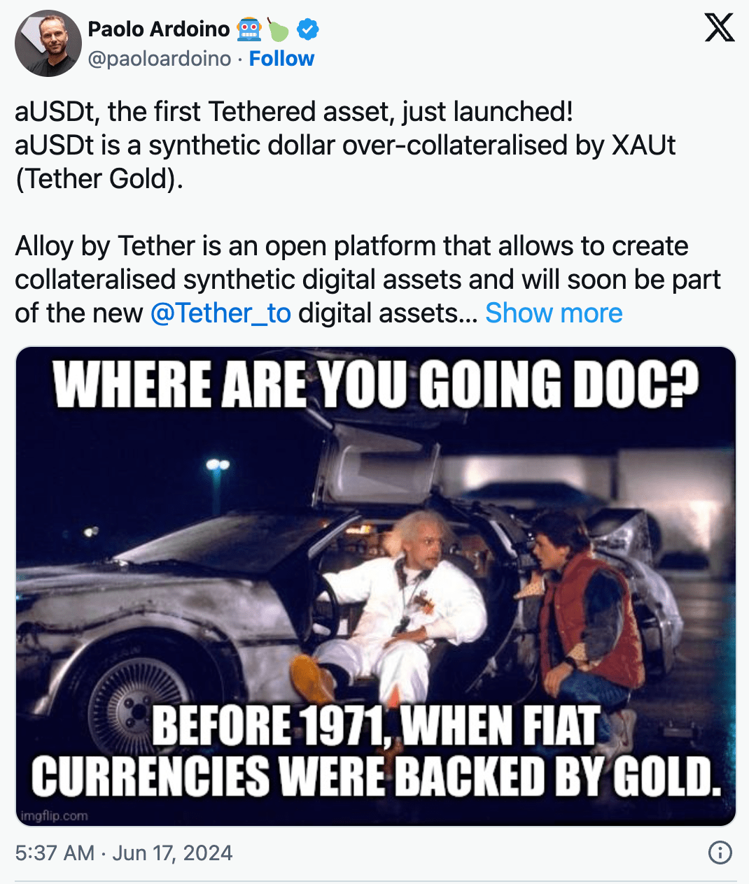 In an interesting X thread, crypto academic Adam Cochran posits that Tether is trying to expand into other assets and into DeFi at a time when Coinbase is using Base to funnel users towards its USDC stablecoin, and banks and fintech firms are muscling in on the stablecoin market too. In other words, Tether wants to diversify in case its USDT golden goose is threatened.