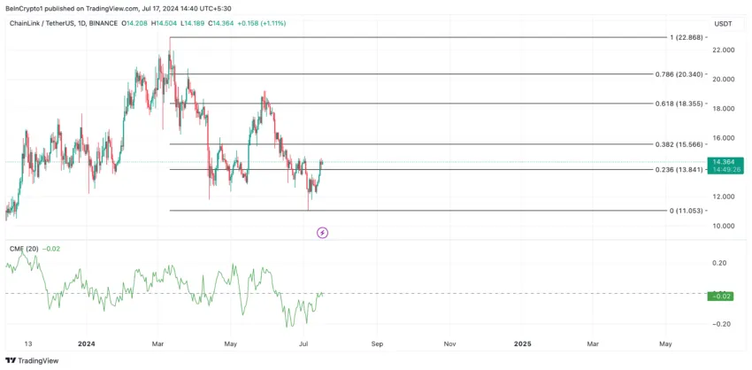Although LINK’s value has surged by double digits in the past week, its Chaikin Money Flow (CMF) remains trapped below the zero line and continues its downtrend.