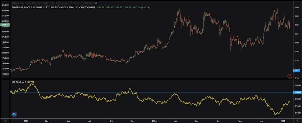 From mid-2024, Ethereum did show hints of recovery, gaining traction alongside a gradual rise in the buy-sell ratio. However, the persistent sub-1.00 ratio reflects lingering market skepticism. Observers suggest that a shift above 1.00 would indicate renewed confidence and a potential bullish breakout for Ethereum.