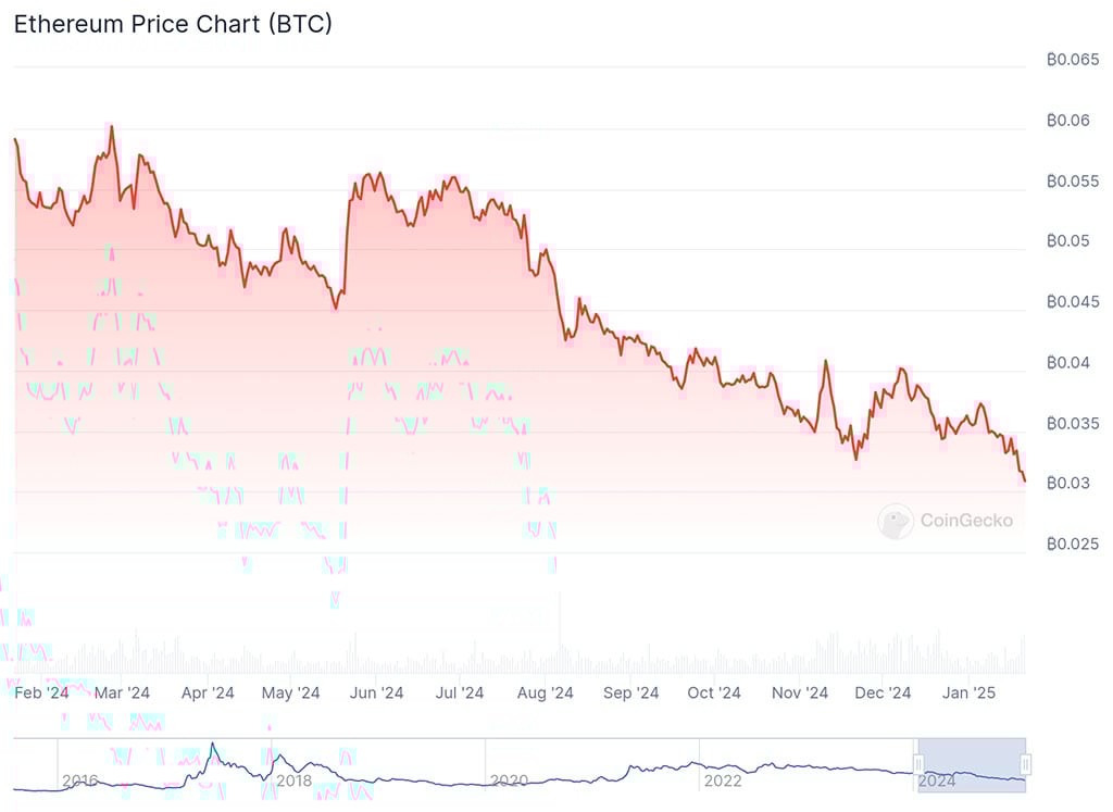 Ethereum ETH $3 344 24h volatility: 1.7% Market cap: $402.94 B Vol. 24h: $58.54 B has hit a striking low against Bitcoin BTC $105 211 24h volatility: 0.3% Market cap: $2.08 T Vol. 24h: $121.41 B , sinking to levels unseen since March 2021. The value of one Ether (ETH) dropped to 0.03 BTC on Sunday, a steep 50% decline from its standing a year ago, according to CoinGecko. In stark contrast, Bitcoin has surged ahead, outperforming Ether and other assets alike, as the cryptocurrency hit a new all-time high at $109K on early Monday.