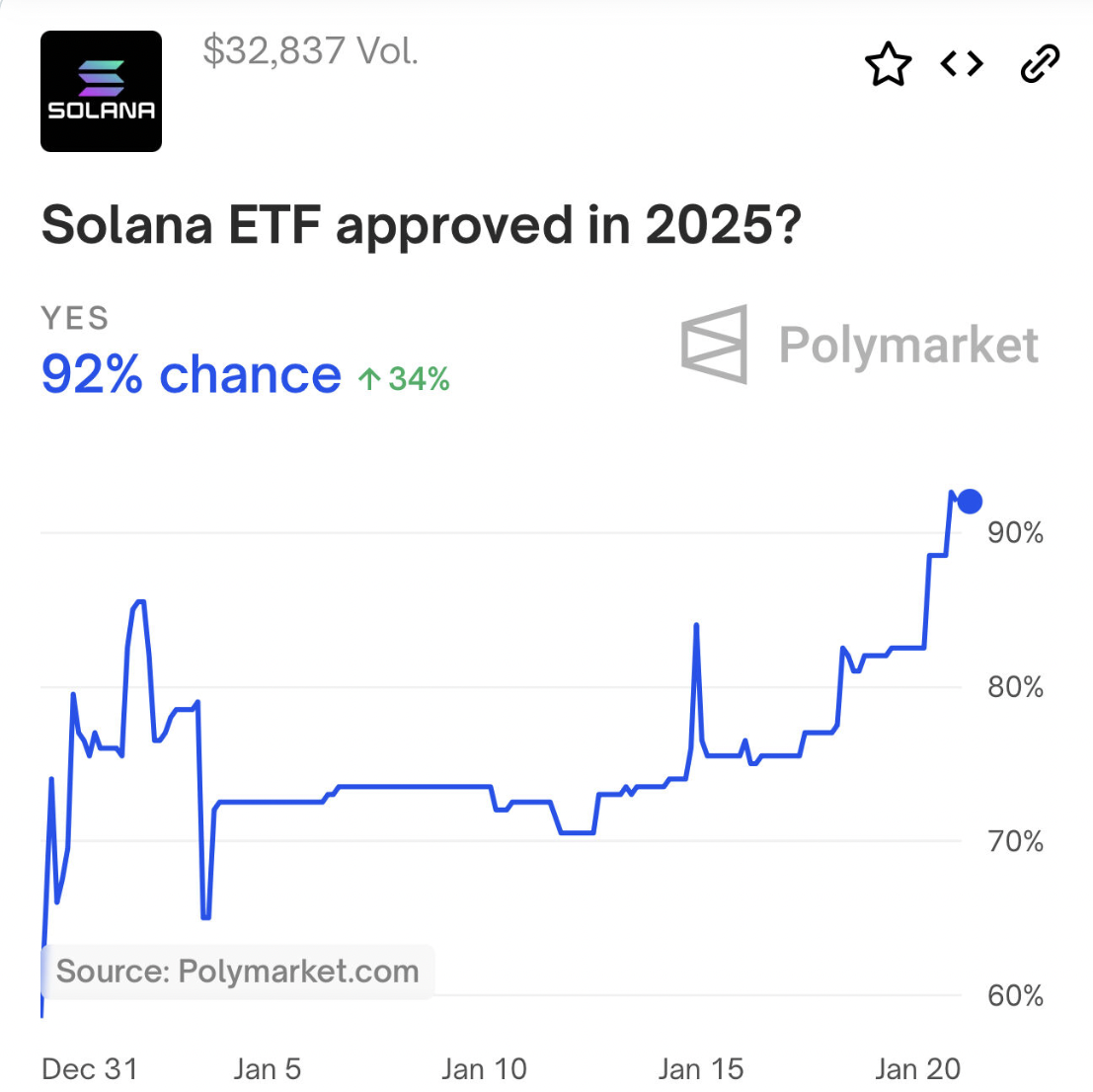 The anticipation of this approval has triggered a strong surge in the SOL price rally. As per the decentralized prediction platform Polymarket, there’s a 92% probability of approval in 2025.