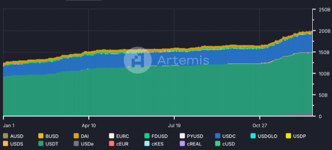 That massive volume highlights stablecoins’ growing role in global finance. The supply of stablecoins also saw explosive growth, rising by over 59% throughout the year and peaking at $200 billion in September. By year-end, stablecoins accounted for 1% of the total US dollar supply, up from just 0.63% at the start of the year.
