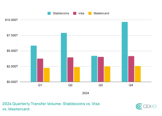 Stablecoins took center stage in 2024, with their transfer volumes eclipsing those of Visa and Mastercard combined. According to a report from crypto exchange CEX.io on January 31, stablecoin transfers reached a staggering $27.6 trillion, marking a 7.7% lead over the traditional payment giants.