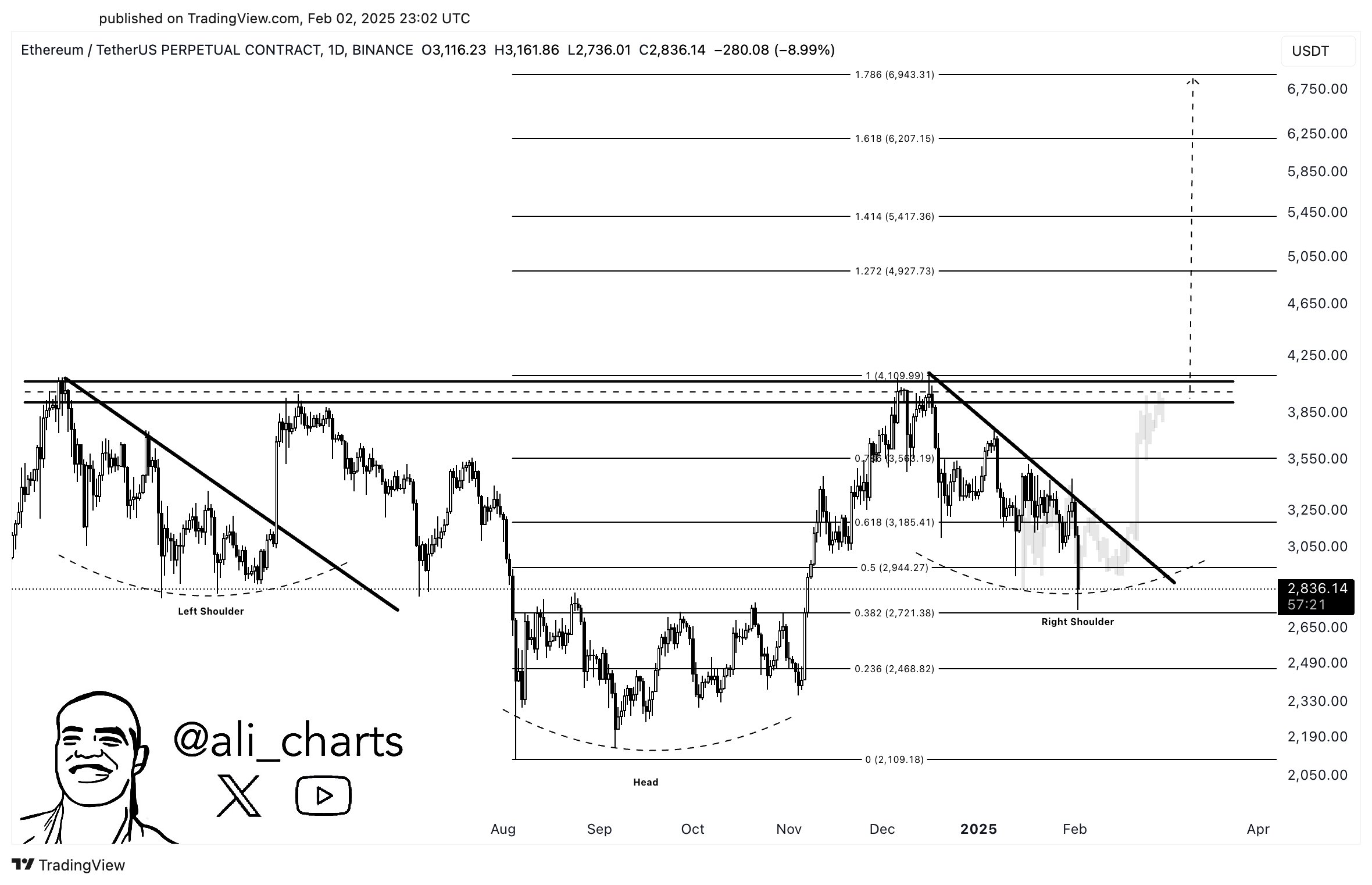Popular crypto analyst Ali Martinez noted that Ethereum price needs to sustain the $2,700 to keep the bullish structure of inverse head and shoulder pattern intact. Once ETH crosses the $4,000 resistance, it can further rally to $7,000 and beyond.