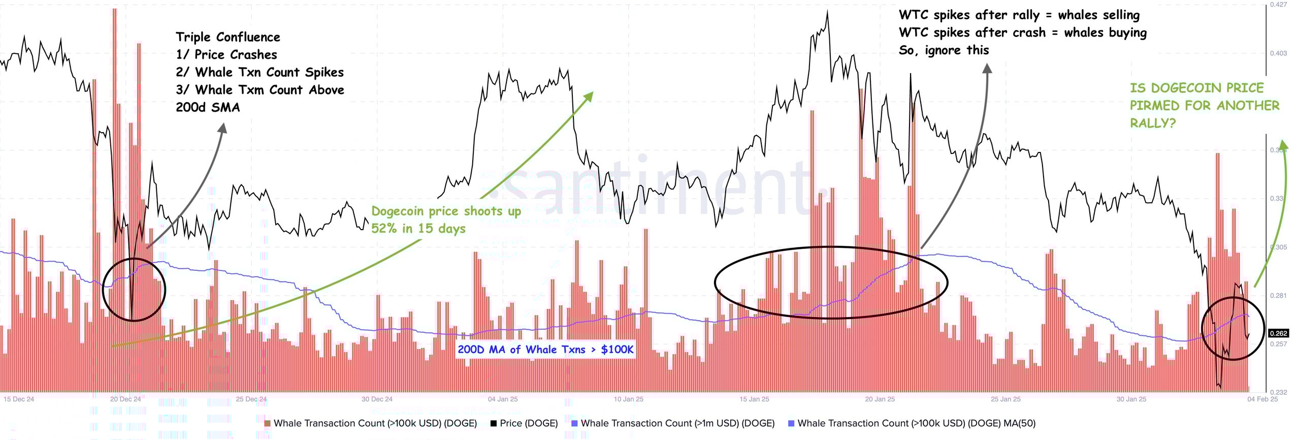 Recent Dogecoin whale transaction counts have spiked above the 200-day moving average, indicating possible future price recovery.