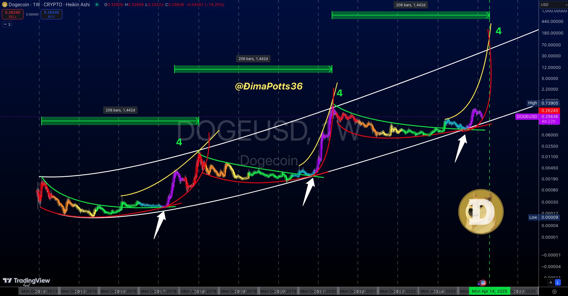 Currently, Dogecoin is in the third cycle, and if history repeats, the analyst suggests that Dogecoin could see a potential peak around the week of April 14, 2025.