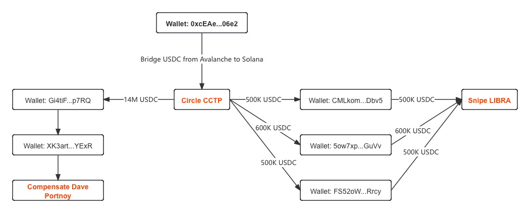 Further analysis suggests that wallet “0xcEAe…06e2” bridged $USDC from Avalanche to Solana and made payments to Dave Portnoy, indicating that the wallet might be directly associated with the $LIBRA team.