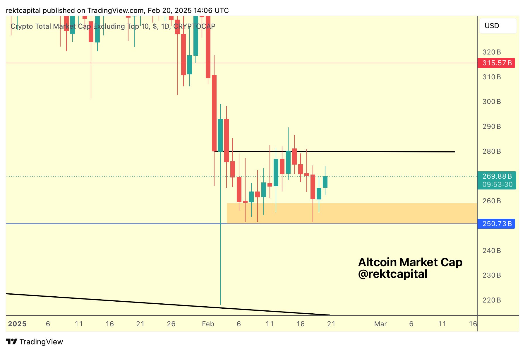 Ju is not alone in being bullish on altcoins despite the current underperformance. Prominent crypto analyst Rekt Capital has highlighted a potential trend reversal in the altcoin market. Following a period of capitulation below the $220 billion mark, the total altcoin market cap has stabilized around the $250 billion level, attempting to establish a solid base.