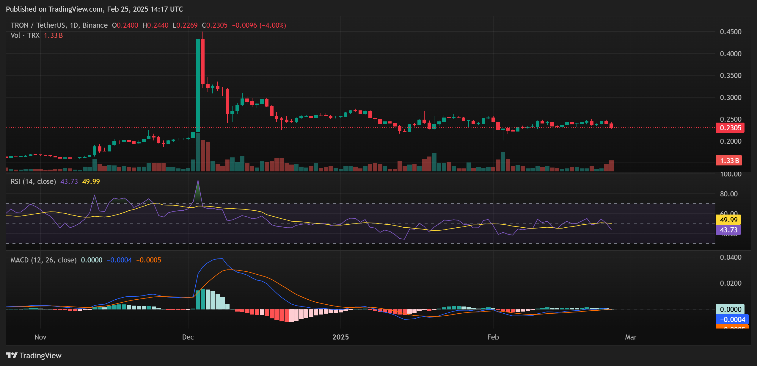 As per the daily chart provided by TradingView below, the Relative Strength Index (RSI) is currently at 43.73, which indicates that TRX is nearing oversold conditions. The gradient of the RSI line suggests that lower prices are likely. However, the situation could turn bullish if Tron successfully reclaims the 20-day EMA with strong volumes.