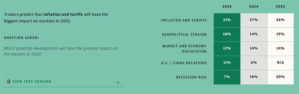 A recent JPMorgan Chase survey confirmed that inflation and tariffs are now top-of-mind concerns for traders. The annual poll featuring institutional clients found that 51% expect these factors to shape global markets in 2025. This is a notable jump from 27% in 2024, signaling mounting worry over policy-driven instability.