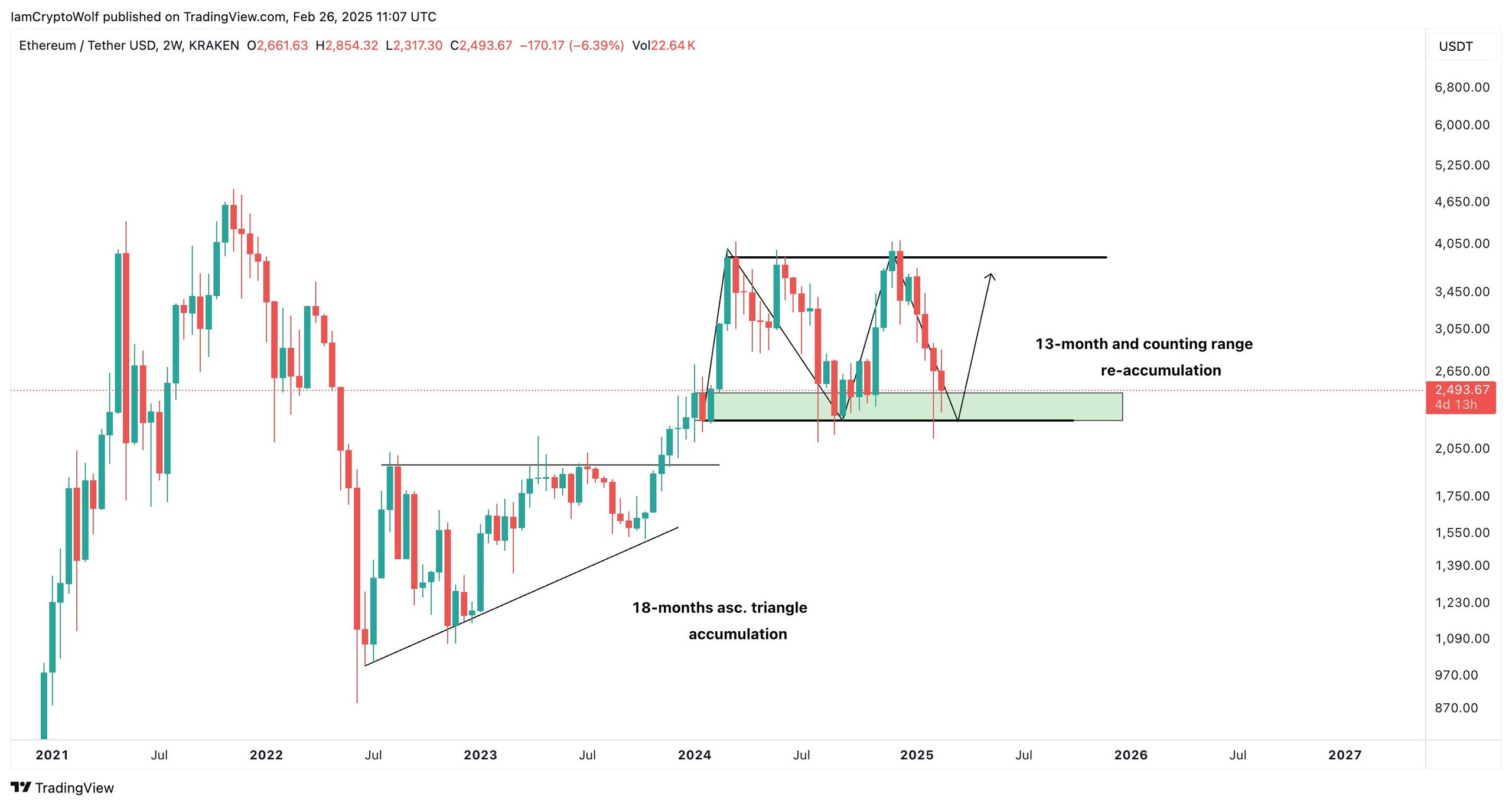While Ethereum struggles under selling pressure, analyst Wolf remains optimistic, viewing the current price movements as part of a healthy re-accumulation range.