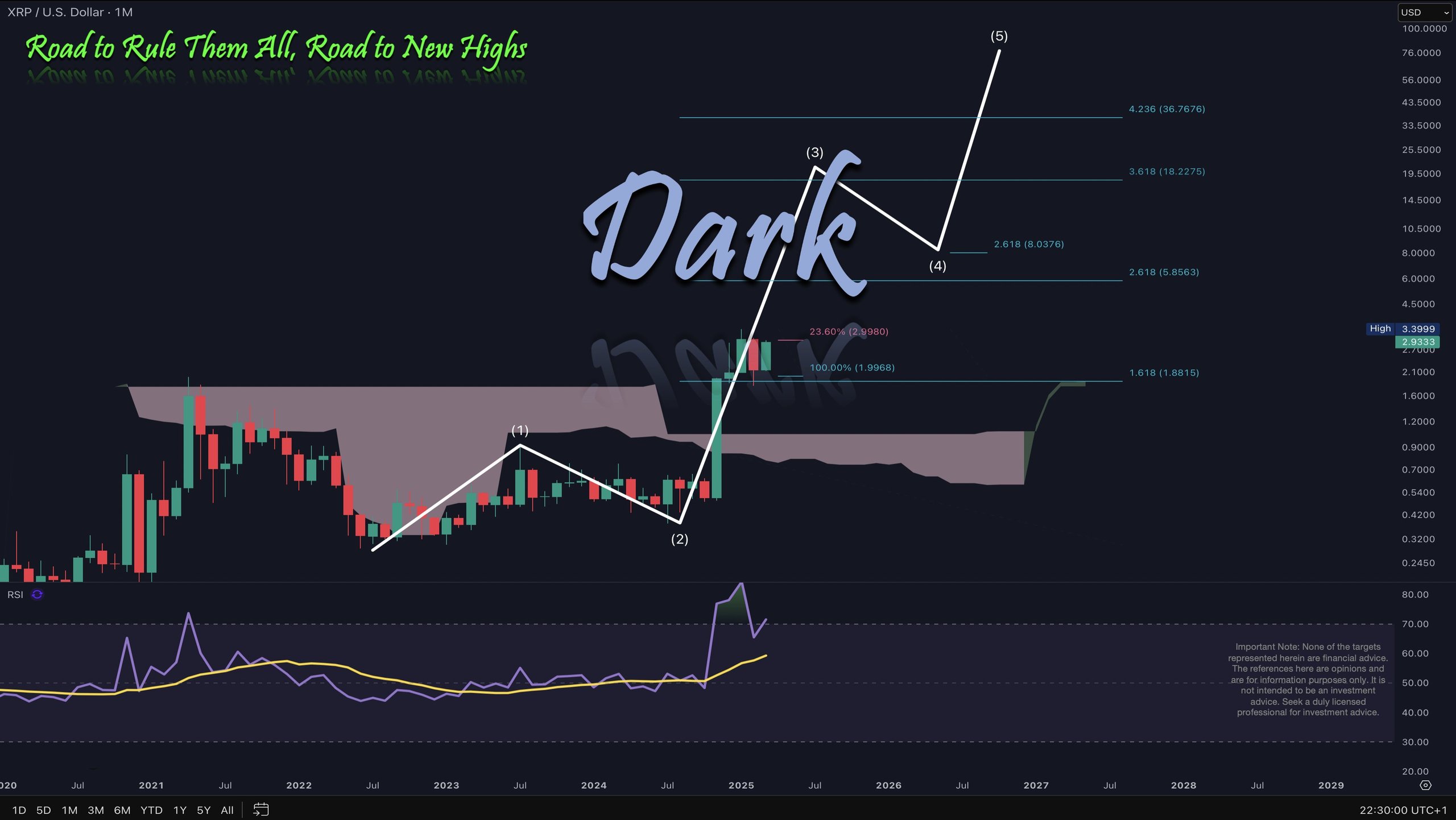 Dark Defender indicated that XRP is currently in the third wave of an Elliott Wave pattern, which typically sees the largest price movement. If the projection holds, a correction (wave 4) may occur before the fifth wave drives XRP to new all-time highs ($77.7).