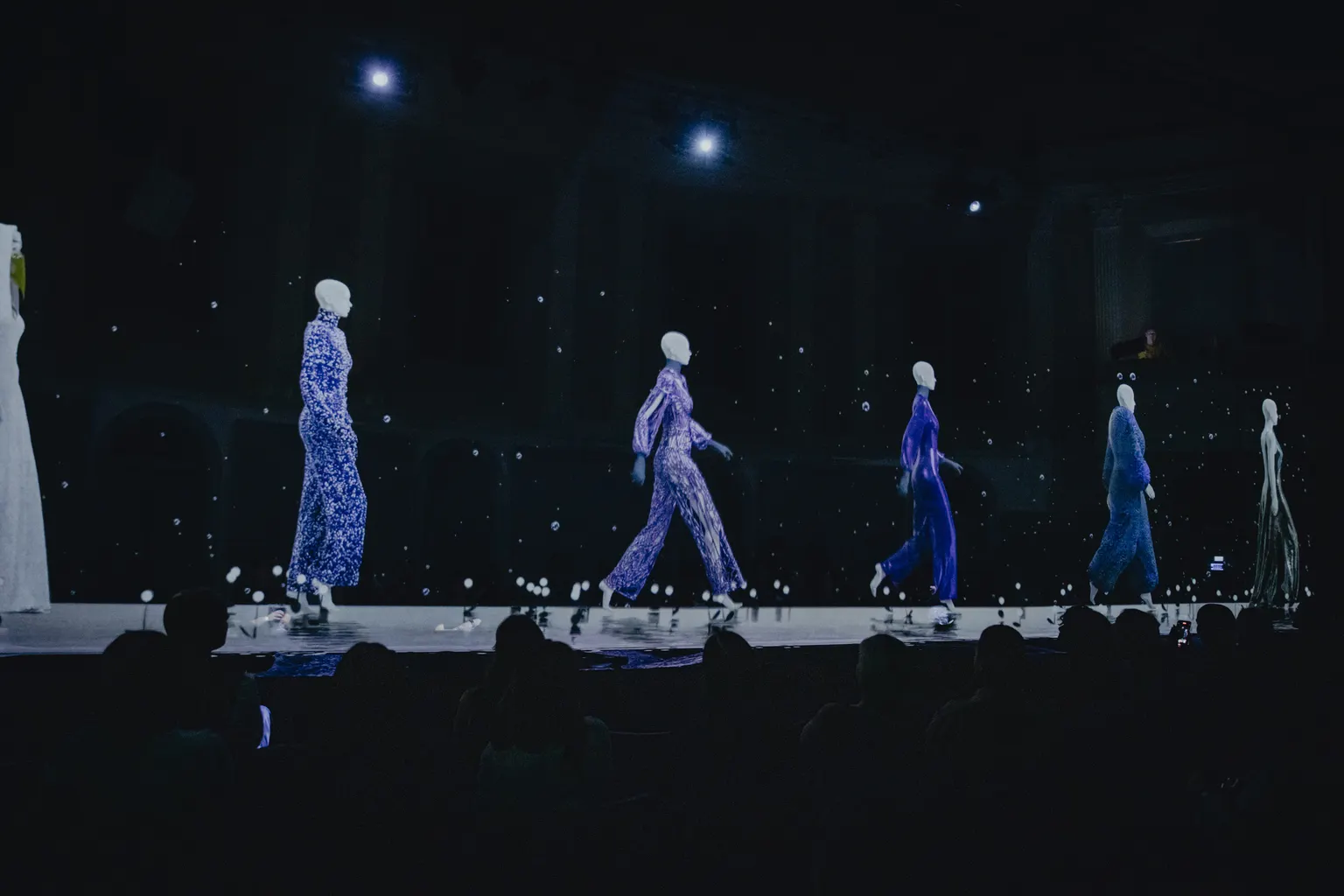 As the show commenced, lights darkened and six projectors (three on each side of the stage) fired away, simulating the fluid movements of six-and-a-half foot-tall avatars who strutted—and occasionally swam—down the runway, sporting designs from nine digital fashion houses including DressX, The Fabricant, and Code Couture.