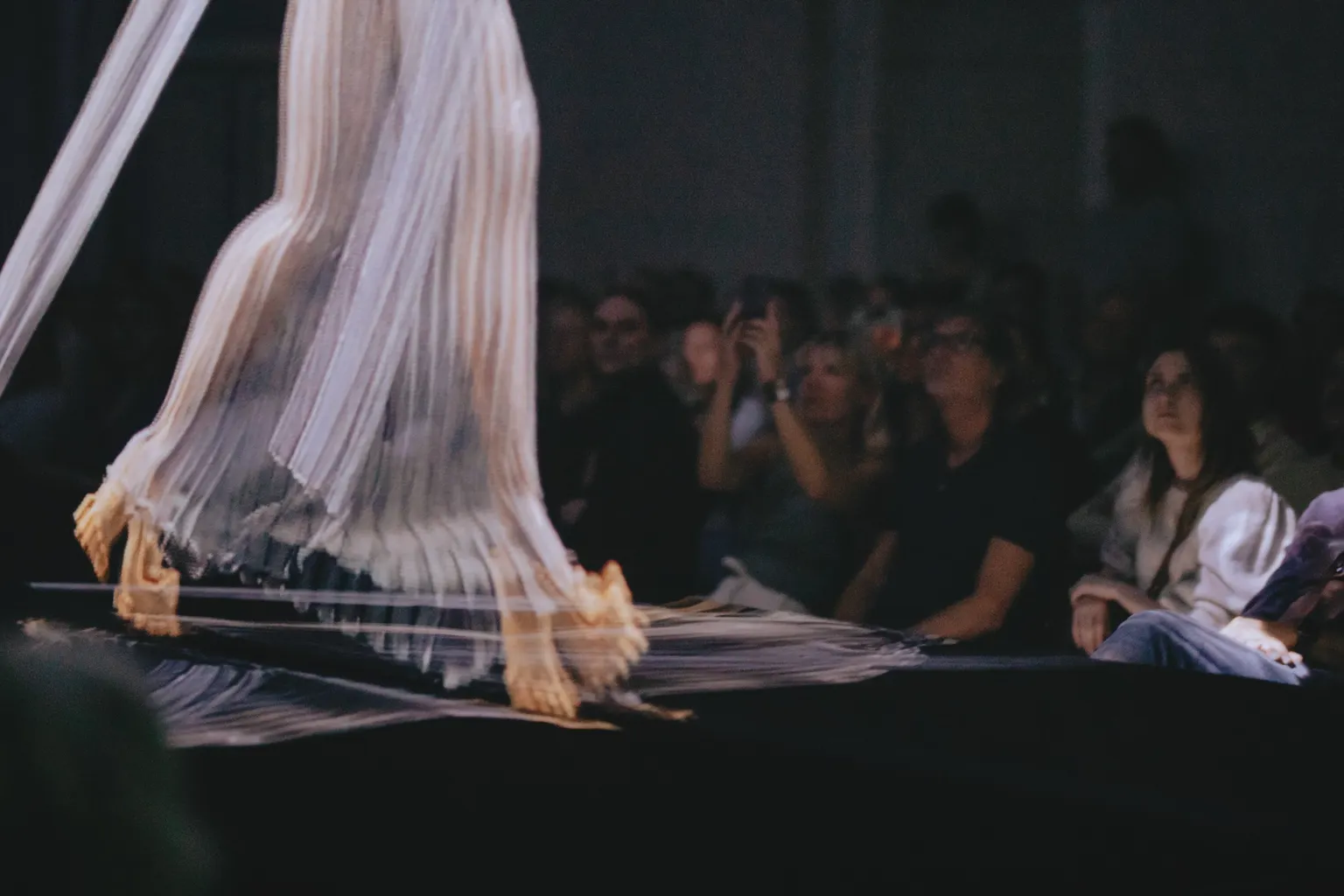 Attendees of the event, which closed Amsterdam Fashion Week last weekend over four performances, filed into a room featuring a large catwalk bifurcated by a translucent screen.