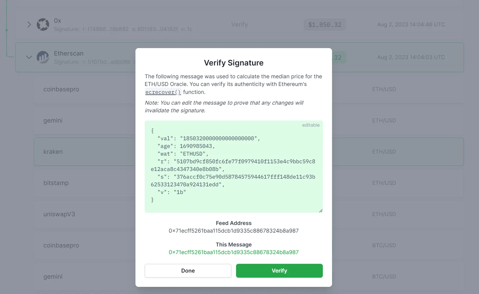 Chronicle also introduces the Verify function, which enables users to juxtapose the signature displayed on Chronicle’s interface with its twin on the blockchain for a specific block, ensuring a match and verifying that the reported data is legitimate.