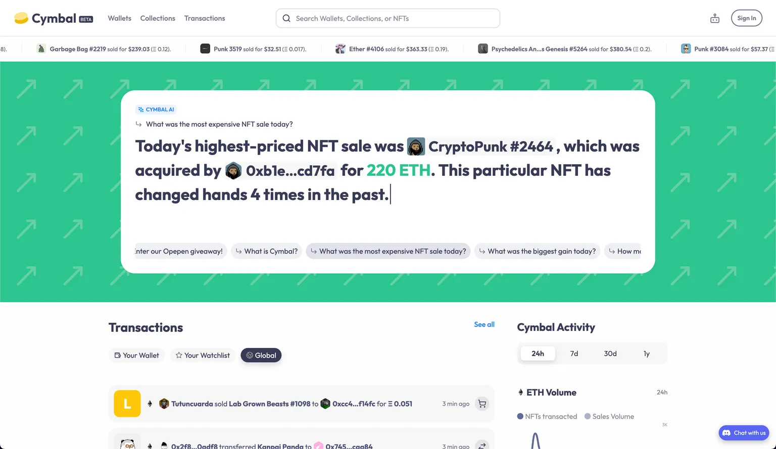 Cymbal looks more like a social network than a pure data resource, serving up dashboards that take transaction details and wrap them up with NFT artwork—from the Bored Ape Yacht Club and other top collections—along with data trends, public information on known wallet owners, relevant news stories from media outlets, and more.
