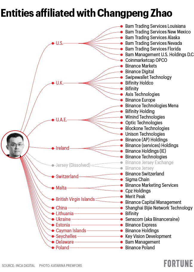 In a review of Binance entities shared with Fortune, the blockchain analytics firm Inca Digital found 40 associated with Zhao, with him serving as the founder, director, owner, or significant shareholder of many of them.