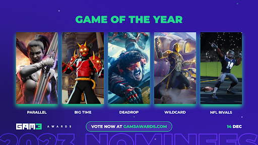 The final GAM3 Awards livestreamed ceremony is scheduled for December 14th, 2023 to be hosted on Twitch, YouTube and X among other streaming platforms; with gameplay premiers and exclusive premieres trailers already confirmed from Star Atlas, The Unioverse, among other titles. Last year’s event saw the first public premieres and exclusive footage from several games including Mythic Protocol Riftstorm, Mighty Action Heroes, and NFL Rivals – which has since amassed over 3M+ downloads on their mobile game.