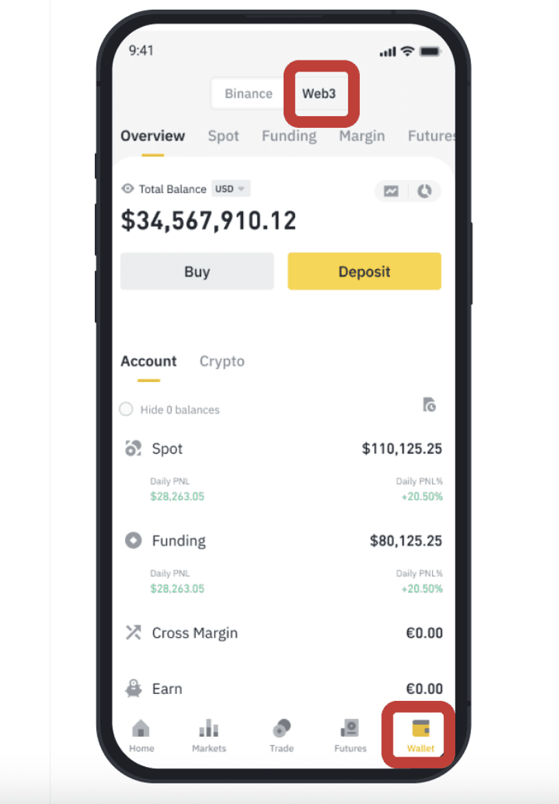 Binance uygulaması "Cüzdanlar" bölümüne tıklayın ve açılan bölümden üst tarafta bulunan "Web3" sekmesine tıklayın.