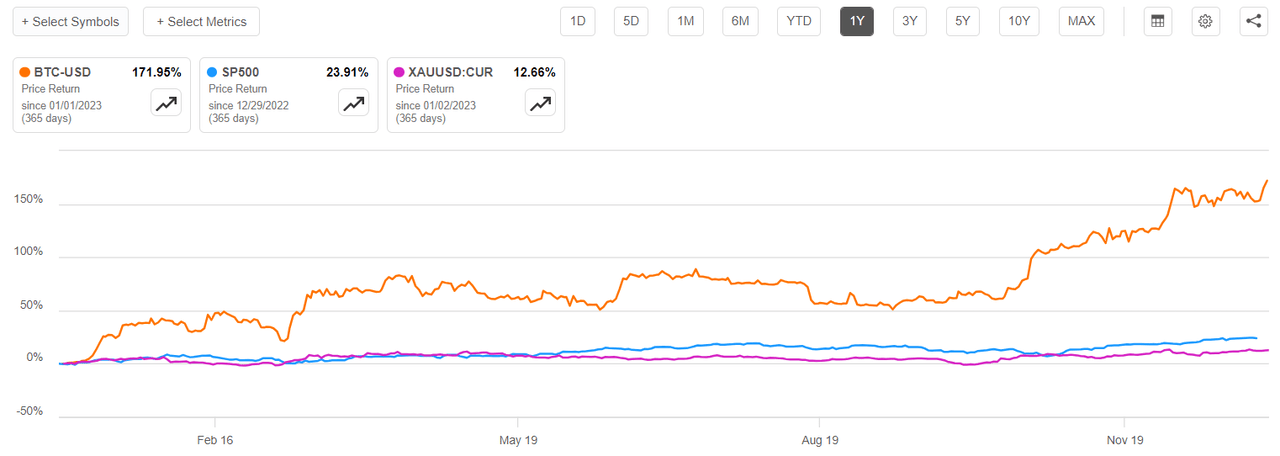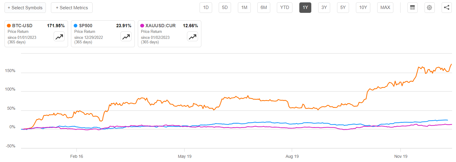Bitcoin has increased by a significant 175% in the past year. It performed better than both gold and global stocks, although it hasn't returned to its 2021 peak of $69,000.![]()